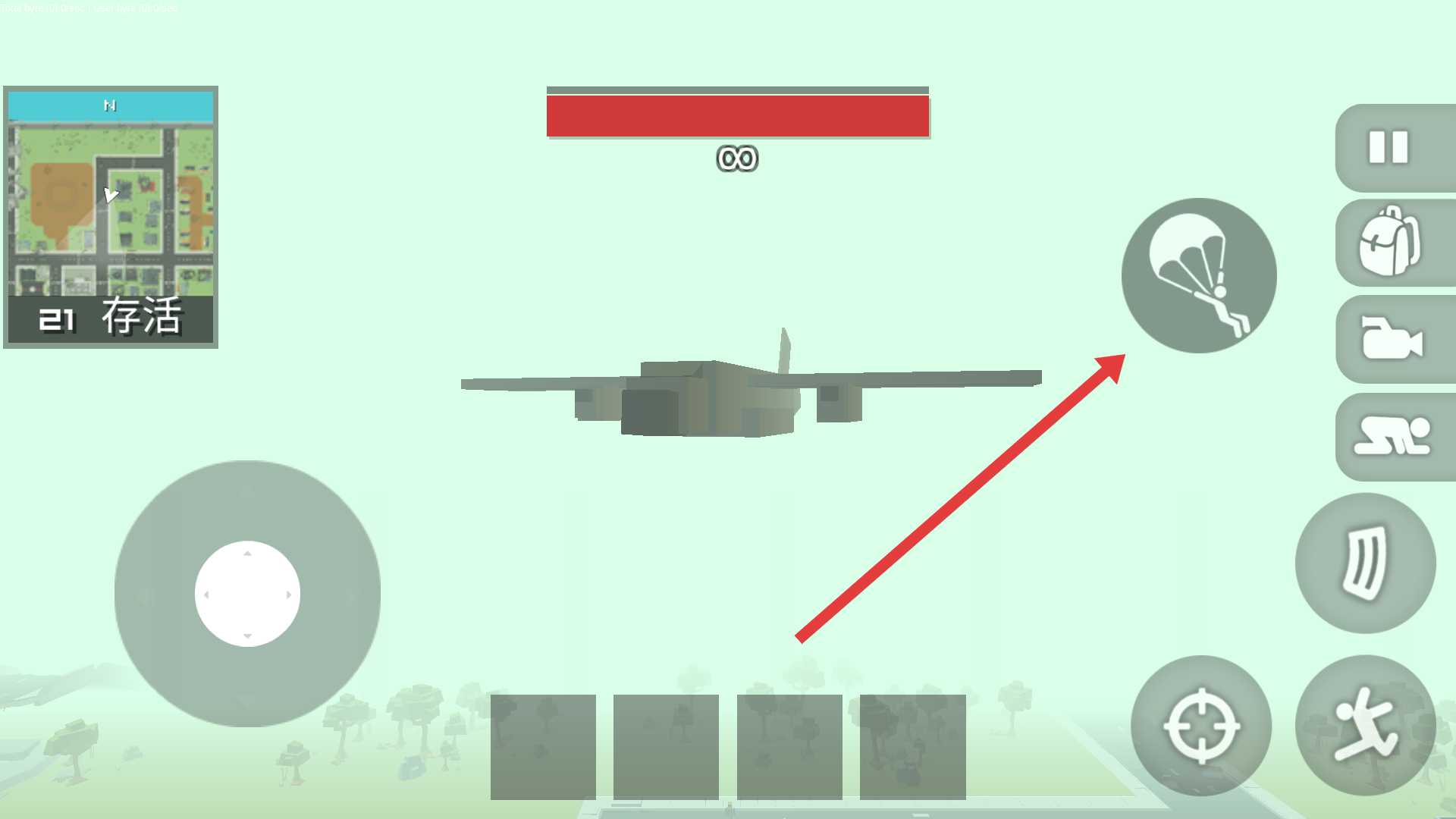 2、飛機(jī)回把你帶到戰(zhàn)場上方,到達(dá)區(qū)域上空點(diǎn)擊跳傘準(zhǔn)備戰(zhàn)斗。