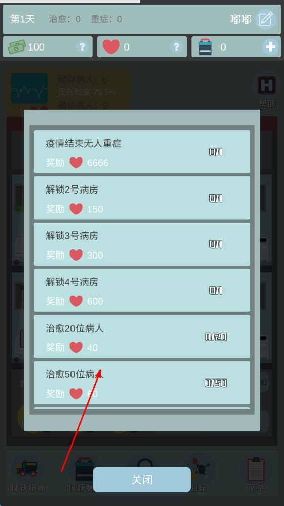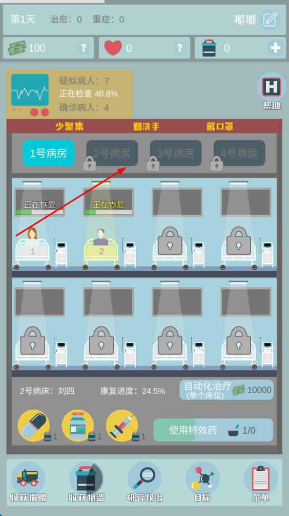 1、進(jìn)入游戲先劃分科室區(qū)域,點(diǎn)擊空地放置內(nèi)科外科等基礎(chǔ)診室,拖動屏幕調(diào)整布局,確??剖曳植己侠肀阌诨颊呔驮\。