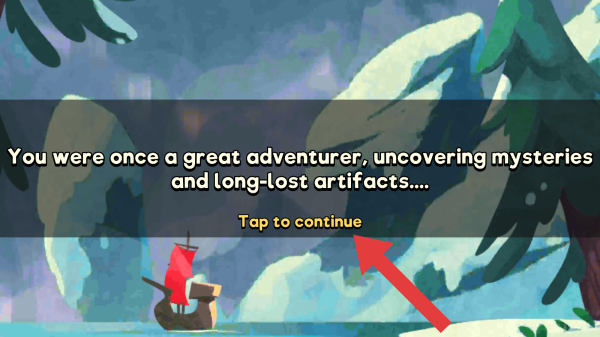 1、這是開(kāi)場(chǎng)或劇情推進(jìn)界面,實(shí)體信息畫(huà)面元素:有船、山林等場(chǎng)景,是冒險(xiǎn)類(lèi)游戲的畫(huà)面,點(diǎn)擊【Taptocontinue】方可進(jìn)入。