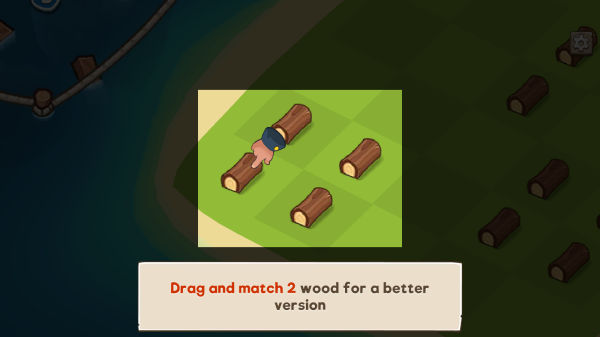 2、拖動(dòng)并匹配2根木材以獲得更優(yōu)版本,展示了木材、角色(是進(jìn)行操作的角色),呈現(xiàn)的是游戲中資源合成/升級(jí)類(lèi)的玩法提示場(chǎng)景。