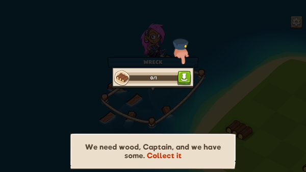 3、根據(jù)提示【我們需要木材】操作,有一個(gè)角色(是船長(zhǎng)相關(guān)角色),畫(huà)面呈現(xiàn)的是游戲中收集木材的任務(wù)提示場(chǎng)景,涉及資源收集玩法。