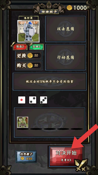 1、玩家通過構(gòu)筑卡組、搭配骰子(怪物)進(jìn)行策略戰(zhàn)斗,圖中呈現(xiàn)了侏儒俠角色的屬性、相關(guān)操作及對決開始等戰(zhàn)斗準(zhǔn)備元素,屬于獨特的策略卡牌對戰(zhàn)玩法場景。