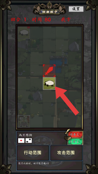 3、呈現(xiàn)了回合制策略對戰(zhàn)場景,包含回合、時間(時間80)、角色(己方及目標(biāo)兩只綿羊)、行動/攻擊范圍等元素,體現(xiàn)了其回合制策略對戰(zhàn)的玩法特點。