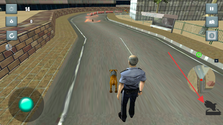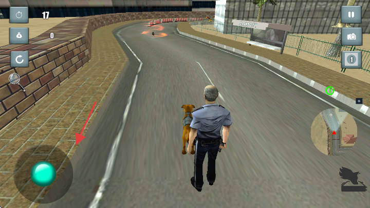2、操控左下角綠色圓形按鈕,控制警察與警犬在道路移動(dòng),躲避障礙,推進(jìn)任務(wù)。
