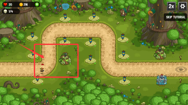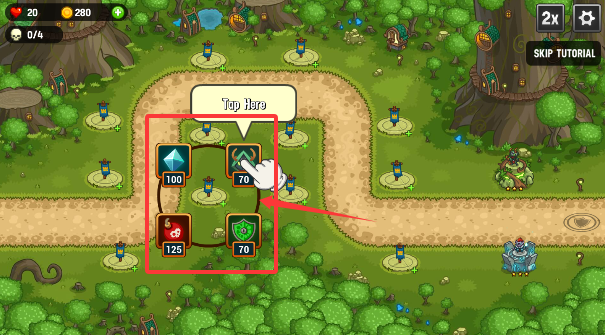 1、游戲開始后消耗初始金幣建造基礎(chǔ)箭塔,合理布置防御工事阻擋怪物前進路線。