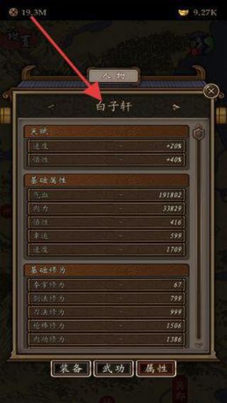 2、進入人物界面,查看【白子軒】屬性(天賦、基礎屬性、各項勢力),了解角色戰(zhàn)力。