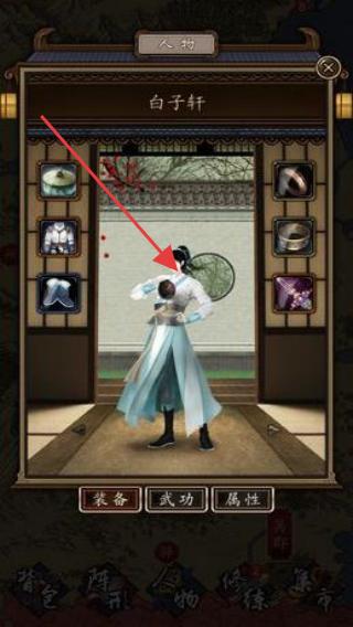 1、進入游戲界面后,點擊裝備頁,關注紅箭頭指向部位,為白子軒穿戴對應裝備,提升角色實力。