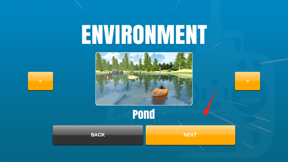 1、環(huán)境選擇界面,顯示“ENVIRONMENT(環(huán)境)”“Pond(池塘)”,有“BACK(返回)”“NEXT(下一步)”按鈕。