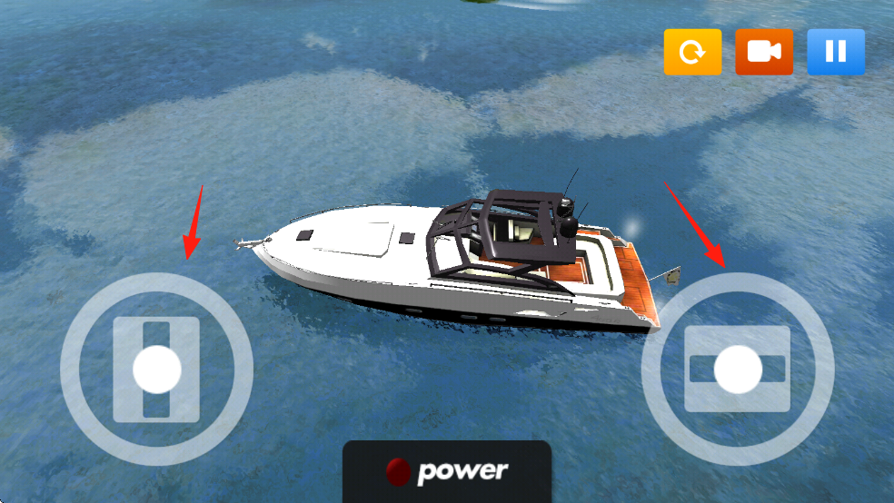 2、船只駕駛界面,有操作按鈕(左右控制)、“power(動(dòng)力)”按鈕,顯示白色游艇。