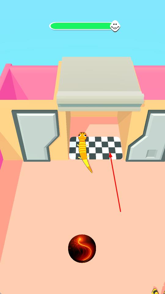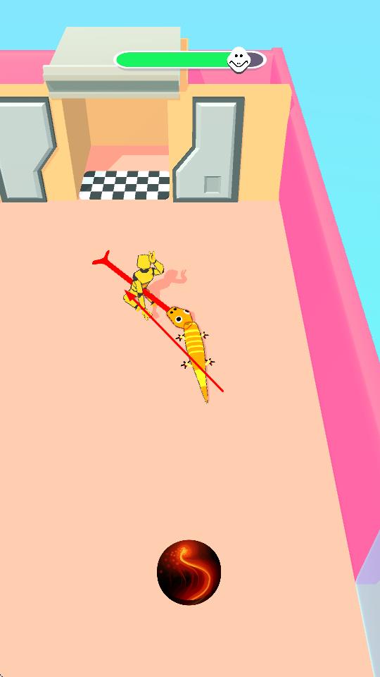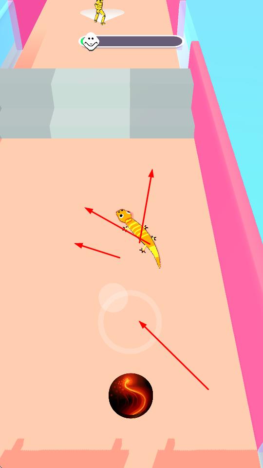 1、滑動屏幕控制黃色蜥蜴移動方向,在粉色跑道、房間場景穿梭,躲避障礙,向目標(biāo)推進。