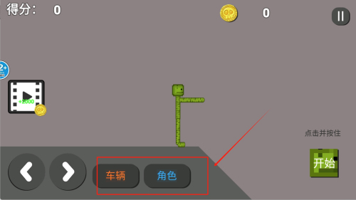 3、游戲準備階段通過底部紅框選項選擇車輛或角色,點擊開始后長按屏幕操控移動收集金幣。