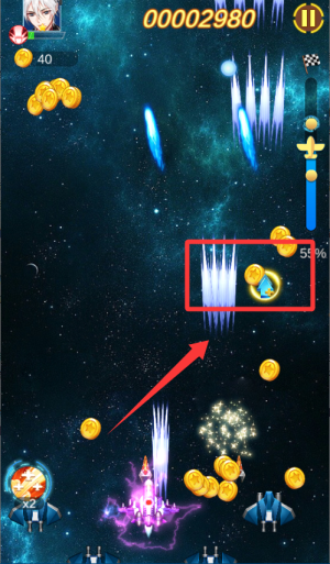2、關(guān)卡中會(huì)隨機(jī)出現(xiàn)強(qiáng)化道具,紅色道具提升攻擊力,藍(lán)色道具增加防護(hù)罩。