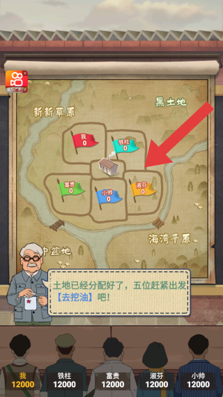 2、實(shí)體信息有新新草原、黑土地、中盆地、海灣平原等區(qū)域名稱,以及文字“土地已經(jīng)分配好了,五位趕緊出發(fā)【去挖油】吧!的任務(wù)提示,屬于分配挖油任務(wù)的場景。
