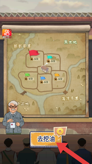 3、顯示各區(qū)域6塊資源量,人物及【去挖油】按鈕,是該游戲中挖油任務(wù)相關(guān)的場景界面。