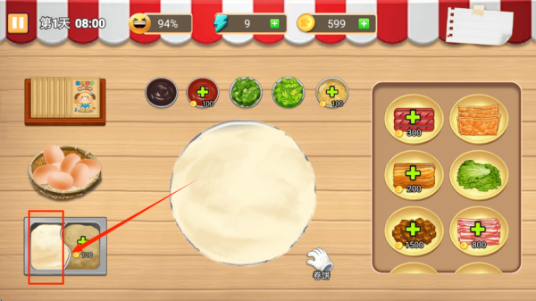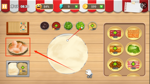 1、訂單制作玩法:根據(jù)顧客訂單滑動(dòng)屏幕操控竹蜻蜓攤面糊,點(diǎn)擊添加雞蛋火腿等配料,卷制完成后點(diǎn)擊裝盤(pán)交付,注意訂單超時(shí)會(huì)影響口碑。