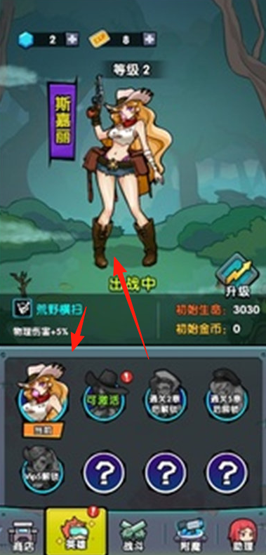 2、在英雄界面,選擇“斯嘉麗”等出戰(zhàn)角色,查看技能(如荒野橫掃),確認(rèn)陣容。