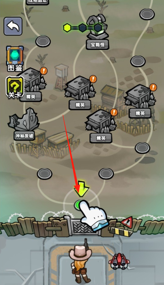 3、地圖界面點擊綠色箭頭指引關(guān)卡,進入戰(zhàn)斗,布置防御操控英雄,抵御僵尸進攻。