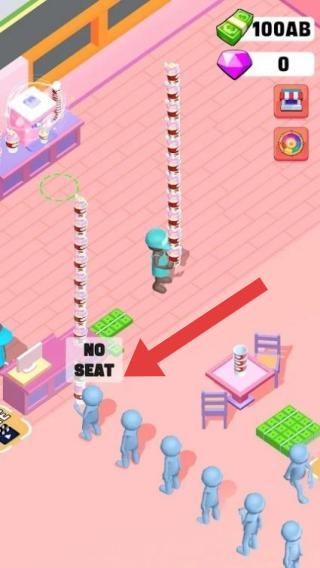 1、顯示NOSEAT角色、貨幣(100AB)、鉆石等元素,屬于休閑益智的解壓,玩法是經(jīng)營餐廳、安排顧客就座等。