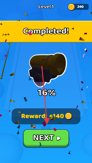 3、完成Level1,出現(xiàn)【Completed!】,獲取140金幣獎勵,點擊【NEXT】,進入下一關(guān),挑戰(zhàn)新消除任務(wù)。