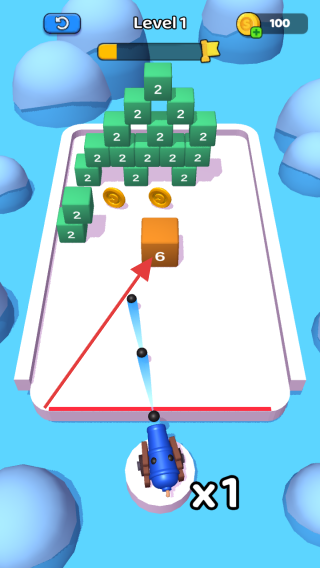 2、發(fā)射炮彈,讓其沿紅線軌跡,擊中數(shù)字【6】的橙色方塊,借助彈射,清除周圍綠色方塊,收集金幣。