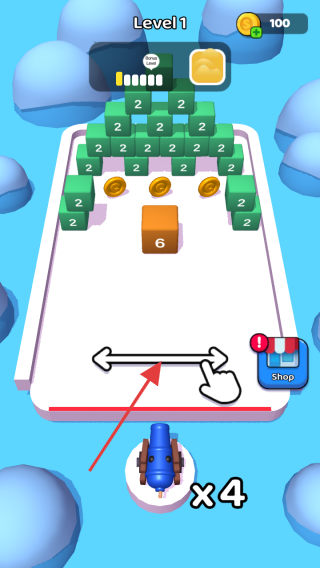 1、Level1中,拖動箭頭指的方向桿,調(diào)整藍色炮臺角度,瞄準(zhǔn)綠色方塊與金幣,準(zhǔn)備發(fā)射炮彈消除方塊。