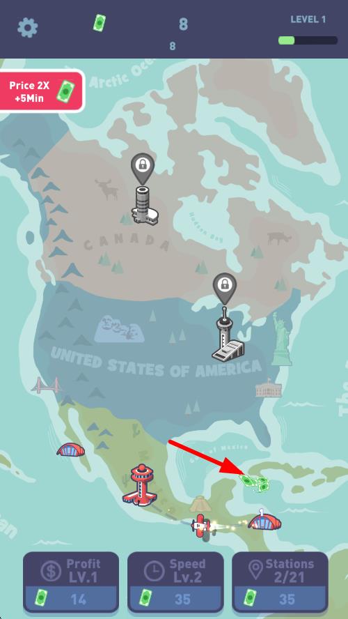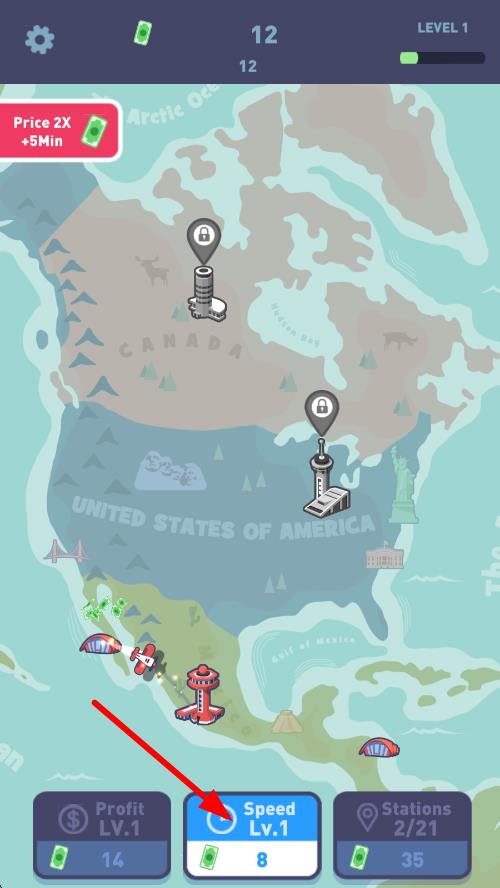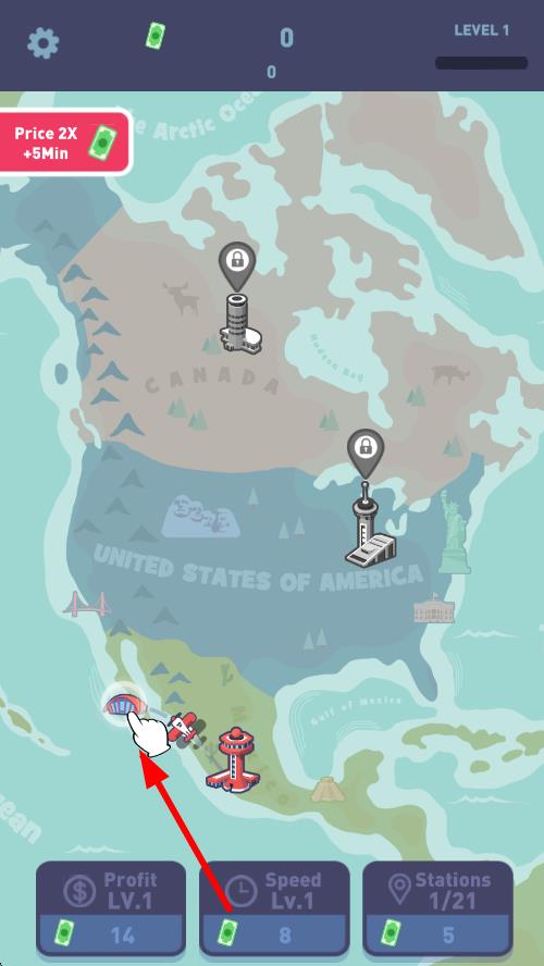 1、進入游戲后點擊“收購”按鈕拿下首個小型機場,通過點擊屏幕加速航班起降,積累金幣用于擴建跑道與候機樓。