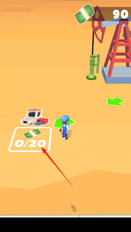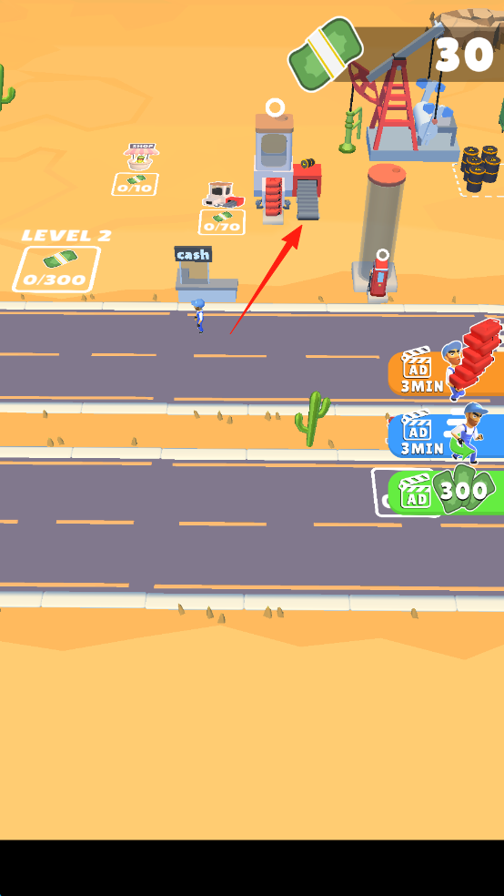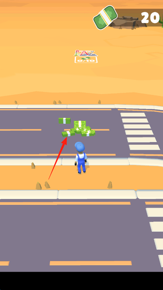 1、操控角色,沿道路移動(dòng),拾取綠色鈔票(紅箭頭),積累資源。