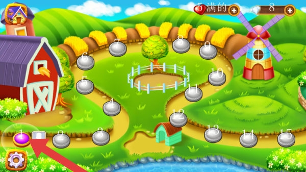 2、畫(huà)面中有標(biāo)有數(shù)字(1-15)的圓形關(guān)卡圖標(biāo),顯示游戲的關(guān)卡推進(jìn)系統(tǒng),玩家通過(guò)推進(jìn)關(guān)卡體驗(yàn)農(nóng)場(chǎng)相關(guān)玩法。