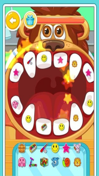 3、玩家扮演牙醫(yī)給動物(圖中為獅子)治療、裝飾牙齒,通過操作工具、選擇裝飾元素打造獨特牙齒造型,有豐富的牙科診療和創(chuàng)意裝飾玩法。