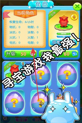 3、角色界面,升級“當前角色”提升“火抗、火耐”等屬性,利用“尋寶游戲我最強”優(yōu)勢,解鎖新蛋,獲取更強戰(zhàn)力,推進關(guān)卡。