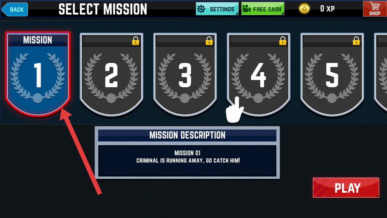 1、在真實(shí)警司警犬追兇模擬器的任務(wù)選擇界面,點(diǎn)擊高亮的【MISSION1】,開啟追捕逃犯的任務(wù)。