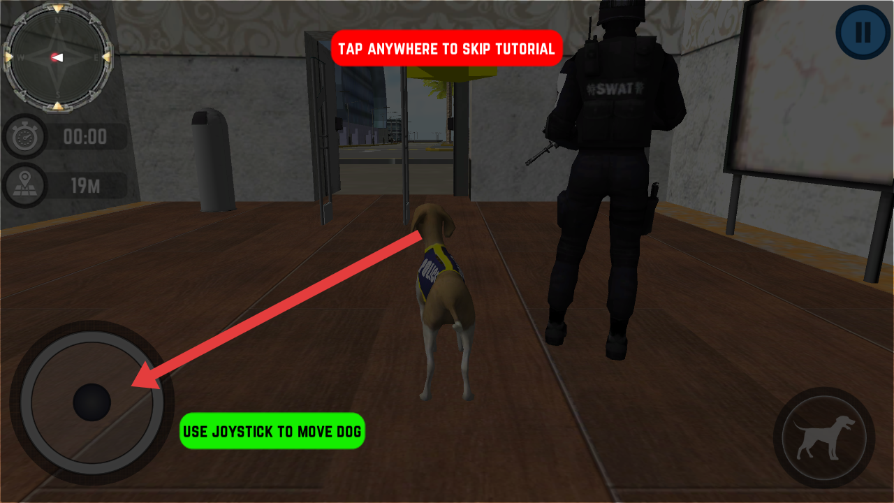 2、進(jìn)入真實(shí)警司警犬追兇模擬器的游戲后,通過左下角搖桿【USEJOYSTICK】操控警犬移動(dòng),也可點(diǎn)擊屏幕跳過教程。