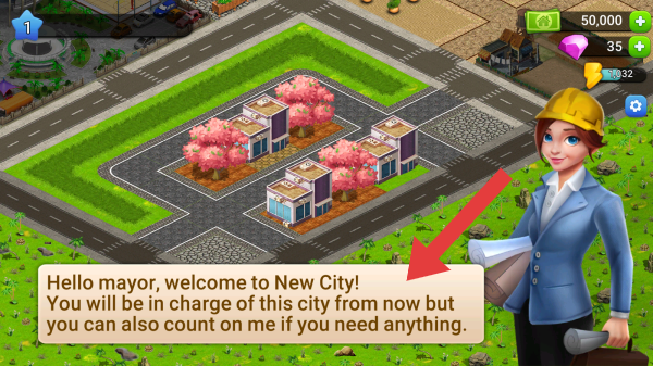 1、場景呈現(xiàn)城市規(guī)劃建設,有建筑、道路、綠化,提示文字,還有資源顯示(錢幣50000、鉆石35等),屬于經(jīng)營模擬、城市建造玩法。