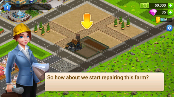 2、畫面呈現(xiàn)城市與農(nóng)場場景,還有資源顯示(錢幣50000、鉆石35等),屬于模擬經(jīng)營類,玩法包含城市建設、農(nóng)場修復與經(jīng)營。