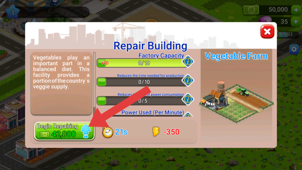 3、顯示修復需消耗42000錢幣、耗時21秒、減少350某種資源(是糧食),還涉及生產(chǎn)時間、電力消耗等屬性,屬于模擬經(jīng)營類農(nóng)場建筑修復環(huán)節(jié)。
