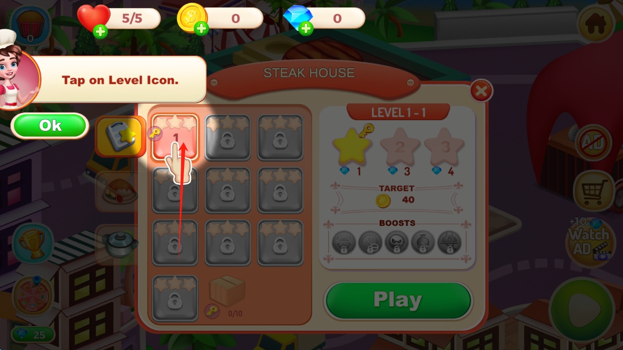 2、選擇關卡,注意收集限時食材,可能用于合成稀有菜品,利用每日登錄獎勵獲取免費食材與加速解鎖。