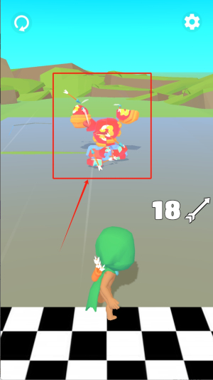 2、進(jìn)入戰(zhàn)斗環(huán)節(jié)后鎖定紅框內(nèi)的彩色目標(biāo),觀察右上角"18"數(shù)值表示剩余彈藥,點(diǎn)擊射擊按鈕發(fā)動(dòng)攻擊。