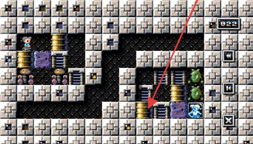 2、在本關(guān)卡界面,順著紅色箭頭指引,繞開【機器人、綠色怪物】,借助場景箱子、通道,朝目標(biāo)位置移動闖關(guān)。