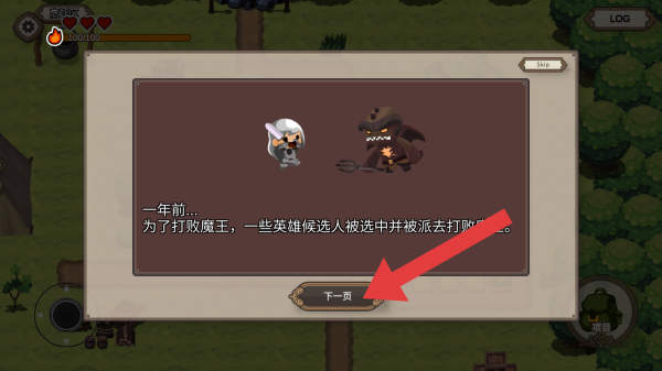2、畫面呈現(xiàn)的是開場(chǎng)劇情對(duì)話,講述“一年前為打敗魔王,英雄候選人被派去作戰(zhàn)”的背景故事,【下一頁(yè)】按鈕用于推進(jìn)劇情流程。