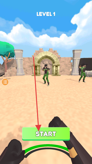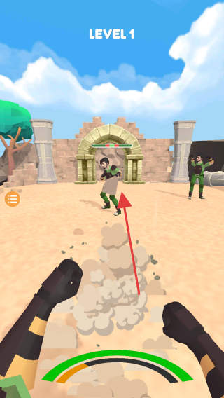 2、第1關(guān)戰(zhàn)斗過(guò)程,操控射擊,擊敗場(chǎng)景中穿綠色服裝的敵人,推進(jìn)關(guān)卡。