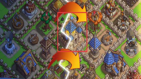 2、點(diǎn)擊紅框內(nèi)城堡,通過(guò)合并/升級(jí)操作(雙箭頭標(biāo)識(shí)),提升建筑等級(jí),增強(qiáng)防御、資源產(chǎn)出,鞏固基地。