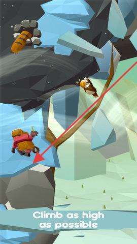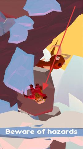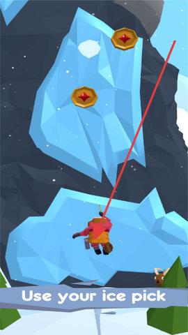 1、游戲開局,操控角色用冰鎬,瞄準(zhǔn)冰壁上帶徽章的點,點擊攀爬,收集徽章,穩(wěn)步向上。