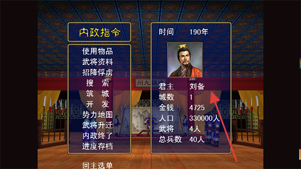 3、游戲剛進(jìn)去就可以查看當(dāng)前年代以及手下的武將和士兵,還有招降,筑城,開發(fā)等功能。