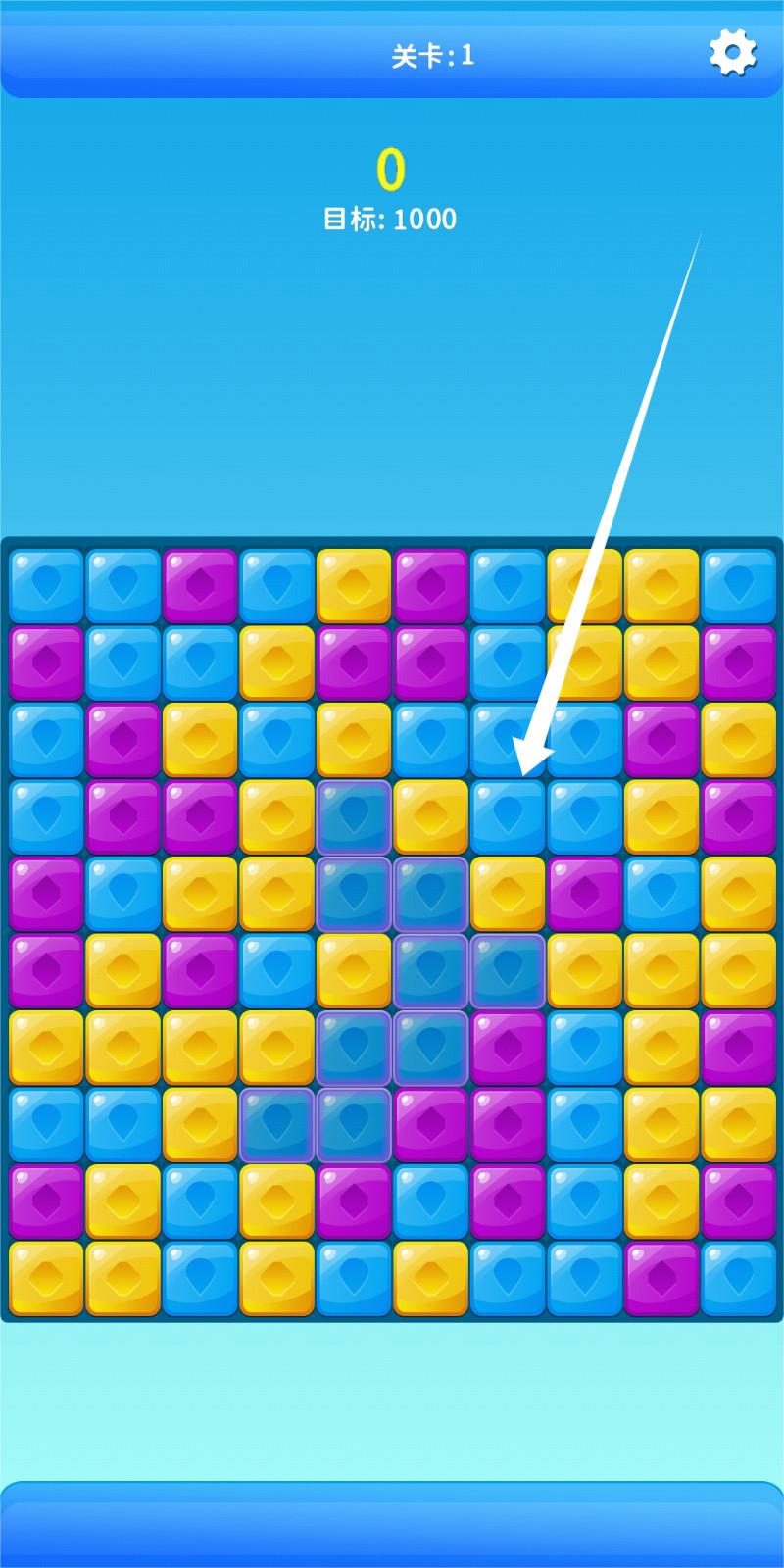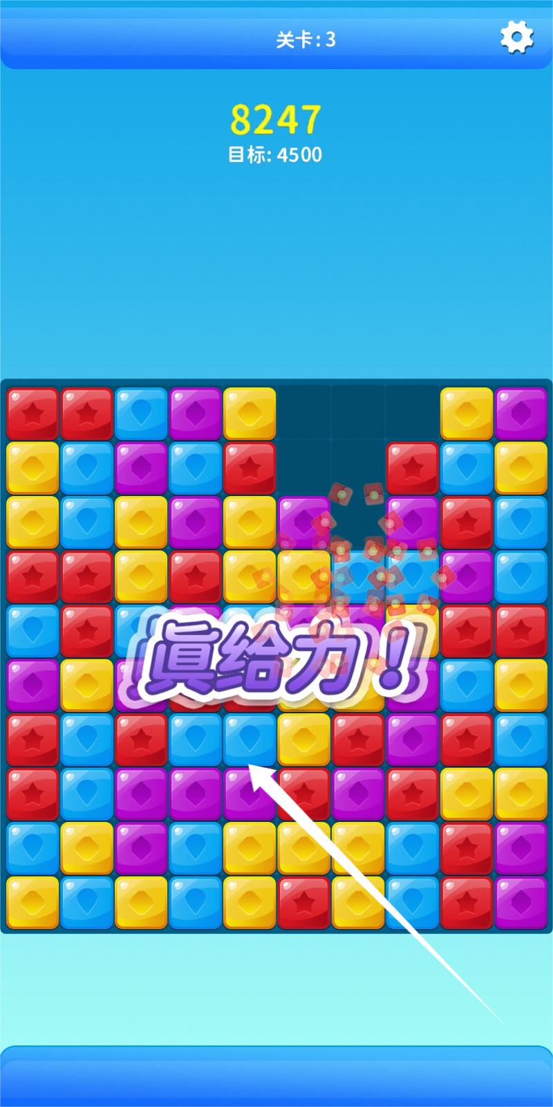 1、點擊相鄰同色方塊,使其消除,積累分數,達成關卡目標,推進進程。