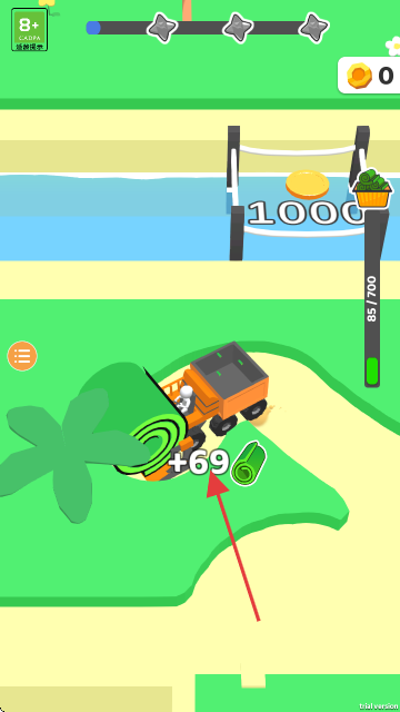 3、駕駛車輛碾壓綠色植被,獲取資源(如+69進度),推進關卡。