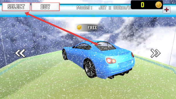 2、在車輛界面,選藍(lán)色賽車,點(diǎn)擊【SELECT】,確認(rèn)車輛,準(zhǔn)備進(jìn)入關(guān)卡,挑戰(zhàn)特技駕駛。