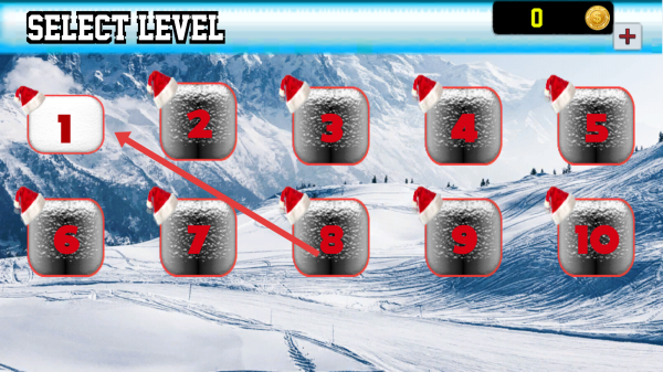 3、進(jìn)入選關(guān)頁,點(diǎn)擊【1】號(hào)關(guān)卡(圣誕帽標(biāo)識(shí)),開始首關(guān),在雪地賽道完成特技任務(wù)。