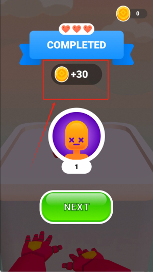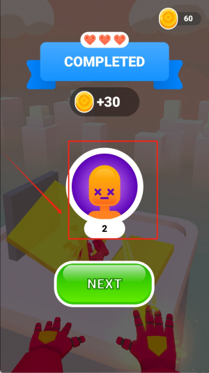 3、完成第二關后獲得3顆紅心評價及30金幣,觀察橙色頭像下方數(shù)字"2"確認進度,再次點擊"NEXT"繼續(xù)游戲。