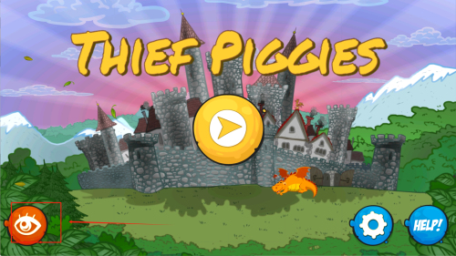 1、在游戲主界面點(diǎn)擊黃色圓形"THIEF PIGGIES"開始按鈕進(jìn)入游戲,注意左下角眼睛圖標(biāo)可切換觀察模式,右下角設(shè)置圖標(biāo)調(diào)整游戲參數(shù)。