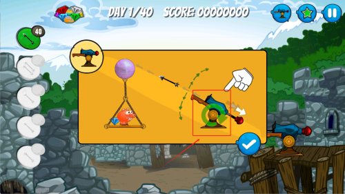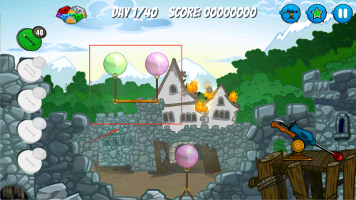 2、進(jìn)入DAY1關(guān)卡后,操作投石機(jī)瞄準(zhǔn)紅框選中的綠色氣球,調(diào)整發(fā)射角度和力度,點(diǎn)擊右側(cè)發(fā)射按鈕將道具投射出去。
